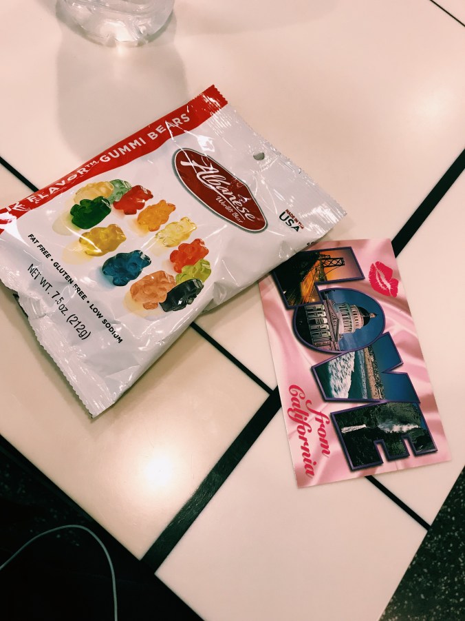 My boyfriend Zeb left on a 4-day trip (he’s a commercial pilot) on Saturday, and as luck would have it – he was flying into the San Francisco airport on Sunday morning! My flight back to Boise departed San Francisco at 9:00am, and Zeb wasn’t due to arrive until 10:00am. Soooo close! I made sure to ask him what gate he was arriving in, and then made a little stop at the airport gift shop when they opened at 5am on Sunday morning. I found a post card and his favorite gummy bears. I like to leave “love notes” whenever and wherever I can!